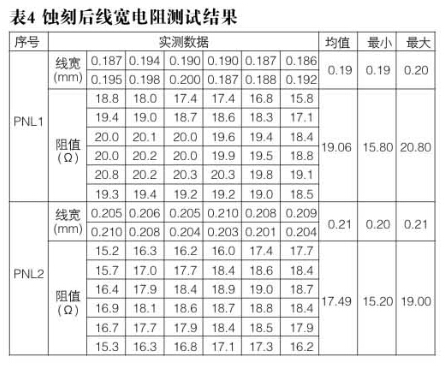 測試板成品量測所有電阻均合格,說(shuō)明板電銅厚控制21+/-3um、成品銅厚控制均值35um到40多um,線(xiàn)寬控制在0.19到0.21之間,成品電阻合格。且蝕刻后的半成品電阻比成品的電阻大1.5Ω左右。故蝕刻量測電阻理論上應做1.5Ω的預大。預大與PCB的設計和阻焊和表面處理流程帶來(lái)的差異有相當大的關(guān)系,不同PCB蝕刻后的電阻預大需要考慮到這些因素。