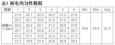 板電銅厚8um,實(shí)際板電后量測量2PNL板的面銅,量測后計算銅厚分布Cpk為1.4>1.33,如表3,板電均勻性比較理想。