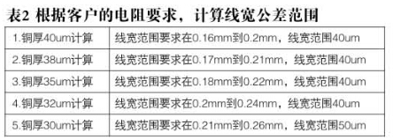 面銅控制中值在35um,則實(shí)際完成銅厚在30到40um之間,根據客戶(hù)的電阻要求,計算線(xiàn)寬公差范圍如下表2,根據下表計算結果,控制銅厚理論優(yōu)區間32到40um之間。