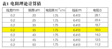 6413mm長(cháng),0.2mm寬的銅導線(xiàn)在不同銅厚下的電阻理論計算值如下表。R=ρ*L/S,ρ為材料電阻率 1.75*10-8Ω*m,L為導線(xiàn)長(cháng)度6413mm,S為導線(xiàn)橫 截面積,實(shí)際電阻上下限分別為:17.6Ω和14.4Ω。 理論計算當銅厚在35um時(shí),0.2mm寬6413mm長(cháng)的導線(xiàn)才能達到理想電阻值16Ω。