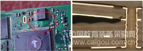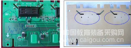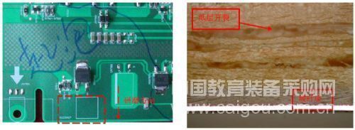 該批樣品為CEM1 類(lèi)型板材,無(wú)鉛回流焊后發(fā)生爆板失效,概率達3%左右,樣品呈長(cháng)條型,其中有一排較大地電磁繼電器(見(jiàn)圖1)。爆板的區域集中在元器件分布少的部位,且該部位和對應的背面的顏色較黃,顏色較其他部位要明顯深(圖2)。通過(guò)切片分析發(fā)現,爆板發(fā)生的區域內部PCB 基材分層在紙質(zhì)層。用近似批次的樣板按照進(jìn)行熱應力試驗,在260℃下由10 秒到30 秒都沒(méi)有發(fā)現類(lèi)似的爆板失效,試驗后的樣品的顏色也沒(méi)有實(shí)際失效的樣品深。同時(shí)用熱分析方法(TGA 和DSC)對爆板區域的材質(zhì)進(jìn)行,發(fā)現該材質(zhì)的熱分解溫度和玻璃態(tài)轉化溫度均符合材質(zhì)的技術(shù)規范。根據以上分析,可以推斷該無(wú)鉛回流焊組裝工藝的條件超出了該類(lèi)型PCB 的技術(shù)要求,回流時(shí)為了保證吸熱的大器件的焊點(diǎn)合格或良好,設置的工藝參數主要是焊接的溫度與時(shí)間過(guò)高過(guò)長(cháng),導致元器件少或空白的區域局部溫度超過(guò)該類(lèi)型板材的技術(shù)規范,終導致產(chǎn)品爆板失效。該失效與板材本身無(wú)關(guān),而與材質(zhì)的選用、設計以及焊接工藝有關(guān)。