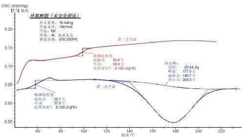 差示掃描量熱法(Differential Scanning Calorimetry)是在程序控溫下,測量輸入到物質(zhì)與參比物質(zhì)之間的功率差與溫度(或時(shí)間)關(guān)系的一種方法。DSC 在試樣和參比物容器下裝有兩組補償加熱絲,當試樣在加熱過(guò)程中由于熱效應與參比物之間出現溫差ΔT 時(shí),可通過(guò)差熱放大電路和差動(dòng)熱量補償放大器,使流入補償電熱絲的電流發(fā)生變化,而使兩邊熱量平衡,溫差ΔT 消失,并記錄試樣和參比物下兩只電熱補償的熱功率之差隨溫度(或時(shí)間)的變化關(guān)系,并根據這種變化關(guān)系,可研究分析材料的物理化學(xué)及熱力學(xué)性能。DSC 的應用廣泛,但在PCB 的分析方面主要用于測量PCB 上所用的各種高分子材料的固化程度(例如圖2)、玻璃態(tài)轉化溫度,這兩個(gè)參數決定著(zhù)PCB 在后續工藝過(guò)程中的可靠性。