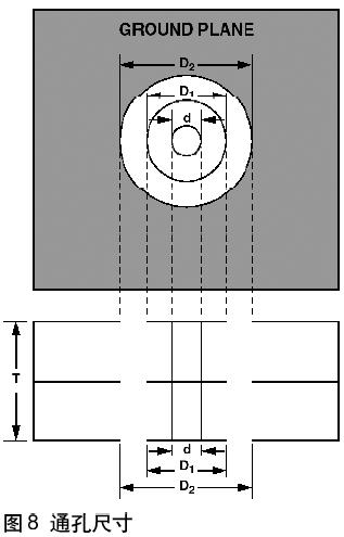 er表示PCB材料的相對磁導率。T表示PCB的厚度。D1表示環(huán)繞通孔的焊盤(pán)直徑。D2表示接地平面中隔離孔的直徑。所有尺寸均以cm為單位。在一塊0.157 cm厚的PCB上一個(gè)通孔就可以增加1.2 nH的寄生電感和0.5 pF的寄生電容;這就是為什么在給PCB布線(xiàn)時(shí)一定要時(shí)刻保持戒備的原因,要將寄生效應的影響降至小。