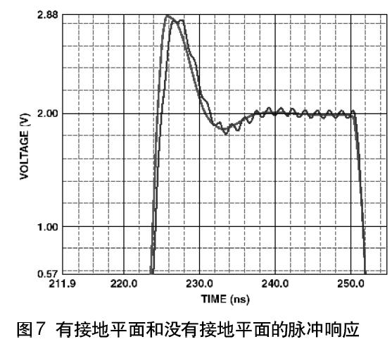 圖7中的振蕩示出了高速運算放大器同相輸入端長(cháng)度為2.54 cm的印制線(xiàn)的影響。其等效寄生電感為29 nH(10-9H),足以造成持續的低壓振蕩,會(huì )持續到整個(gè)瞬態(tài)響應周期。圖7還示出了如何利用接地平面來(lái)減小寄生電感的影響。