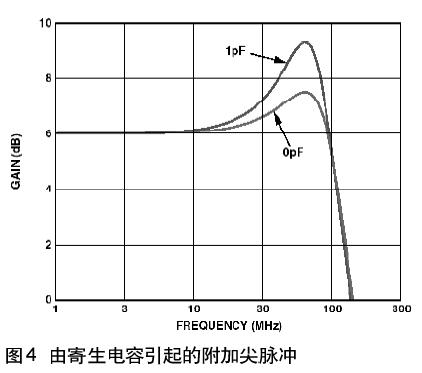 在高速電路中,很小的值就會(huì )影響電路的性能。有時(shí)候幾十個(gè)皮法(pF)的電容就足夠了。相關(guān)實(shí)例:如果在反相輸入端僅有1pF的附加寄生電容,它在頻率域可以引起差不多2dB的尖脈沖(見(jiàn)圖4)。如果寄生電容足夠大的話(huà),它會(huì )引起電路的不穩定和振蕩。