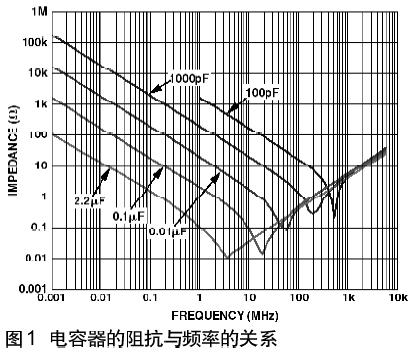 并聯(lián)不同的電容值的電容器有助于確保電源引腳在很寬的頻帶上只能看到很低的交流(AC)阻抗。這對于在運算放大器電源抑制比(PSR)衰減頻率處尤其重要。該電容器有助于補償放大器降低的PSR。在許多十倍頻程范圍內保持低阻抗的接地通路將有助于確保有害的噪聲不能進(jìn)入運算放大器。圖1示出了采用多個(gè)并聯(lián)電容器的優(yōu)點(diǎn)。在低頻段,大的電容器提供低阻抗的接地通路。但是一旦頻率達到了它們自身的諧振頻率,電容器的容性就會(huì )減弱,并且逐漸呈現出感性。這就是為什么采用多個(gè)電容器是很重要的原因:當一個(gè)電容器的頻率響應開(kāi)始下降時(shí),另一個(gè)電容器的頻率響應開(kāi)始起作用,所以能在許多十倍頻程范圍內保持很低的AC阻抗。