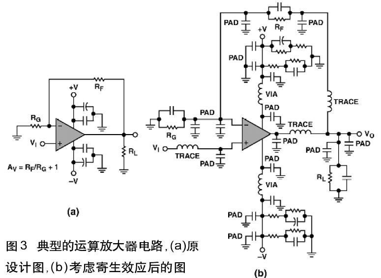 所謂寄生效應就是那些溜進(jìn)你的PCB并在電路中大施破壞、令人頭痛、原因不明的小故障。它們就是滲入高速電路中隱藏的寄生電容和寄生電感。其中包括由封裝引腳和印制線(xiàn)過(guò)長(cháng)形成的寄生電感;焊盤(pán)到地、焊盤(pán)到電源平面和焊盤(pán)到印制線(xiàn)之間形成的寄生電容;通孔之間的相互影響,以及許多其它可能的寄生效應。圖3(a)示出了一個(gè)典型的同相運算放大器原理圖。但是,如果考慮寄生效應的話(huà),同樣的電路可能會(huì )變成圖3(b)那樣。