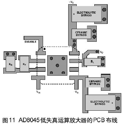 低失真引腳排列允許輸出引腳(專(zhuān)用反饋引腳)和反相輸入引腳之間可以靠近連接,如圖11所示。這樣極大地簡(jiǎn)化和改善了布線(xiàn)。