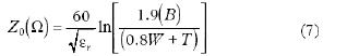 用于帶狀線(xiàn)的特征阻抗計算公式如公式(7)所示。