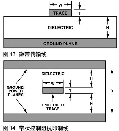 帶狀控制阻抗印制線(xiàn)(參見(jiàn)圖14)采用了兩層接地平面,信號印制線(xiàn)夾在其中。這種方法使用了較多的印制線(xiàn),需要的PCB層數更多,對電介質(zhì)厚度變化敏感,而且成本更高―所以通常只用于要求嚴格的應用中。