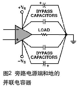 直接從運算放大器的電源引腳入手;具有小電容值和小物理尺寸的電容器應當與運算放大器置于PCB的同一面――而且盡可能靠近放大器。電容器的接地端應該用短的引腳或印制線(xiàn)直接連至接地平面。上述的接地連接應該盡可能靠近放大器的負載端以便減小電源端和接地端之間的干擾。圖2示出了這種連接方法。