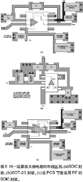 圖9示出了采用SOIC封裝(a)和SOT-23封裝(b)的運算放大器之間的布線(xiàn)區別。每種封裝都有它自身的一些問(wèn)題。重點(diǎn)看(a),仔細觀(guān)察反饋路徑就發(fā)現有多種方法連接反饋。重要的是保證印制線(xiàn)長(cháng)度短。反饋路徑中的寄生電感會(huì )引起振鈴和過(guò)沖。在圖9(a)和9(b)中,環(huán)繞放大器連接反饋路徑。圖9(c)示出了另外一種方法――在SOIC封裝下面連接反饋路徑――這樣就減小了反饋路徑的長(cháng)度。每種方法都有細微的差別。一種方法會(huì )導致印制線(xiàn)過(guò)長(cháng),會(huì )增大串聯(lián)電感。二種方法采用了通孔,會(huì )引起寄生電容和寄生電感。在給PCB布線(xiàn)時(shí)必須要考慮這些寄生效應的影響及其隱含的問(wèn)題。SOT-23布線(xiàn)差幾乎是理想的:反饋印制線(xiàn)長(cháng)度短,而且很少利用通孔;負載和旁路電容從很短的路徑返回到相同的地線(xiàn)連接;正電源端的電容(圖9(b)中未示出)直接放在PCB背面的負電源電容的下面。