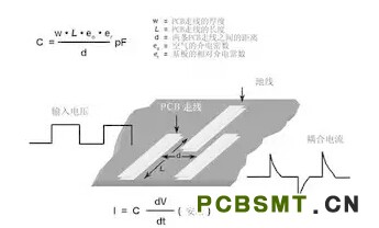 圖5 在PCB上布兩條靠近的走線(xiàn),很容易形成寄生電容。由于這種電容的存在,在一條走線(xiàn)上的快速電壓變化,可在另一條走線(xiàn)上產(chǎn)生電流信號