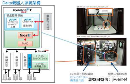 目前市場(chǎng)上比較少見(jiàn)使用單晶片來(lái)實(shí)現工業(yè)機器人的主機控制。從圖中的系統架構圖可以看到,在主晶片Cyclone V SoC中,雙核心Cortex A9中有一個(gè)核心作為運動(dòng)控制,另一個(gè)核心用來(lái)執行EtherCAT主機。雙核心各自負責自己的功能,運動(dòng)控制功能主要執行機器人3只手臂的協(xié)調工作,演算法都放在A(yíng)RM核心。FPGA主要用來(lái)執行Nios軟核心功能。透過(guò)FPGA中的MAC連接3個(gè)伺服驅動(dòng)器。據江允貴透露,參考設計中的伺服驅動(dòng)來(lái)自臺達電子(Delta)。每個(gè)伺服驅動(dòng)中都有一個(gè)FPGA用來(lái)做EtherCAT介面。目前伺服驅動(dòng)中的演算法還是透過(guò)DSP來(lái)實(shí)現。