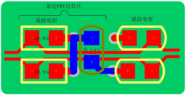 c) 差分信號終端電阻(49.9Ω,有的PHY層芯片可能沒(méi)有)必須靠近PHY層芯片的Rx±、Tx±管腳放置,這樣能更好的消除通信電纜中的信號反射;