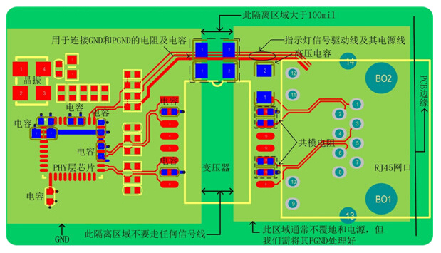 e) 變壓器的兩邊需要割地:即RJ45連接座和變壓器的次級線(xiàn)圈用單獨的隔離地,隔離區域100mil以上,且在這個(gè)隔離區域下沒(méi)有電源和地層存在。這樣做分割處理,就是為了達到初、次級的隔離,控制源端的干擾通過(guò)參考平面耦合到次級;