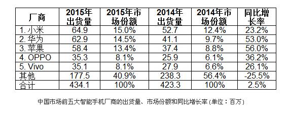 蘋(píng)果鞏固了其三的位置(如下圖所示),市場(chǎng)份額從2014年的8.8%增加至2015年的13.4%,平均售價(jià)提高15.7%至718美元,增加近100美元。