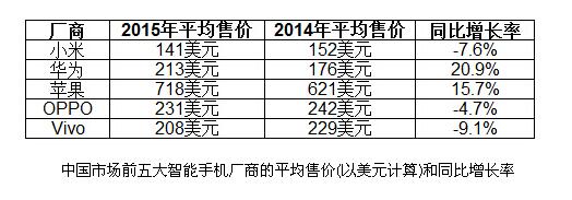 華為2015年在中內地的智能手機出貨量增長(cháng)53%至6290萬(wàn)部,并將其智能手機的平均售價(jià)提高至213美元(如下圖所示)。在市場(chǎng)份額上,僅次于小米位居二,小米的市場(chǎng)份額有所下降,同時(shí)其產(chǎn)品平均售價(jià)下滑7.6%至141美元,這是因為該公司的增長(cháng)主要來(lái)自紅米這款低端機型。
