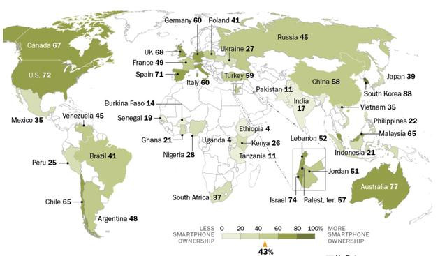 在智能手機普及率上,全球中位數為43%。