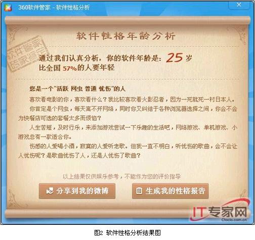 小編還發(fā)現,360軟件性格分析還能分析出我們的軟件年齡,如小編只有25歲(竊喜),說(shuō)明人老心不老哦??蛇@軟件年齡是怎么得出來(lái)的呢?小編猜測是根據安裝軟件的歷史,比如電腦中安裝了WinZip等這類(lèi)老古董的軟件,電腦會(huì )更給你加幾歲;如果像小編360都時(shí)刻更新新的豆瓣電臺,那年齡理應比較年輕了。
