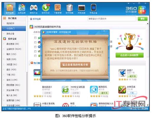 這結果給力準確嗎?神不神馬,小編馬上一試便知。安裝360安全衛士8.5beta版后,一次運行360安全衛士,進(jìn)入“軟件管家”,“360心理學(xué)磚家”會(huì )立刻彈出一個(gè)“軟件性格分析”提示(如圖1)。
